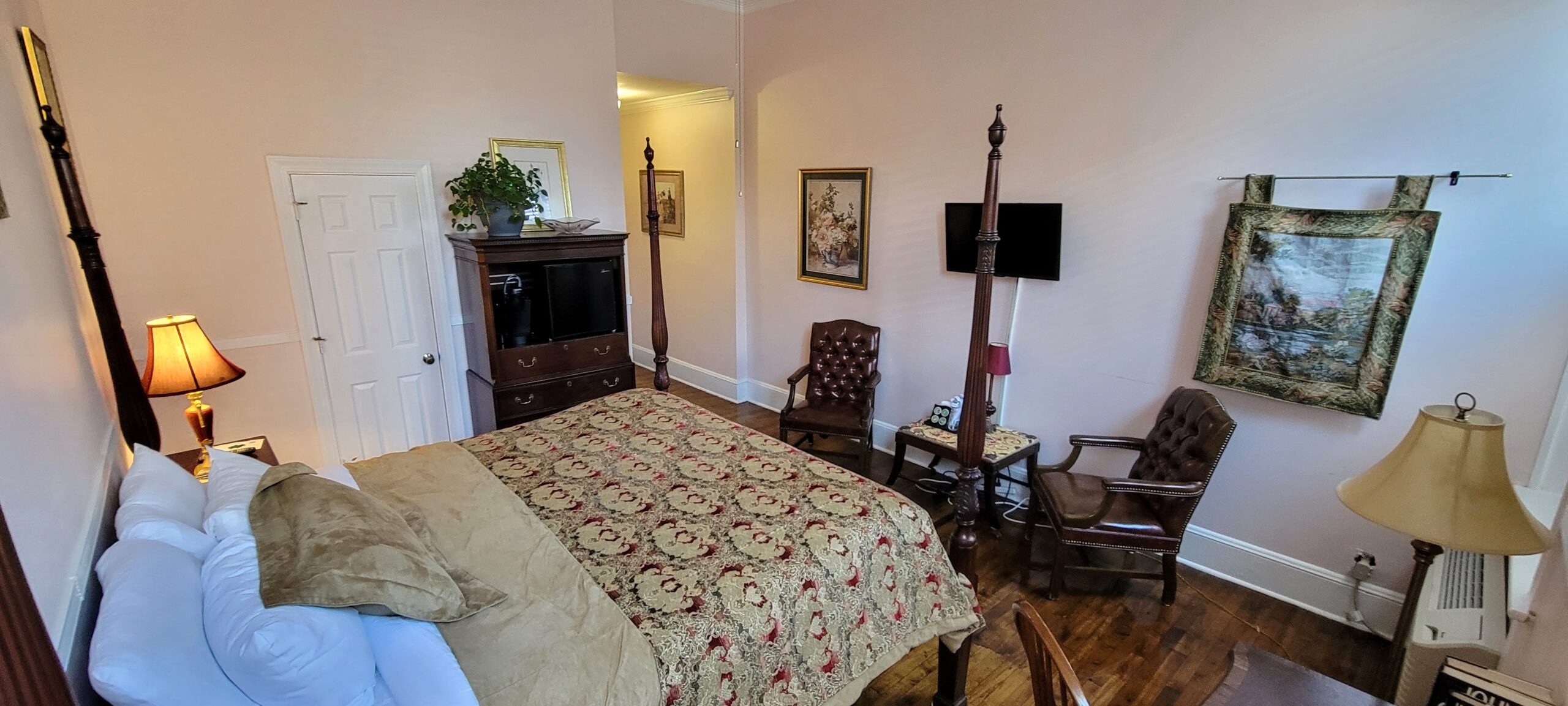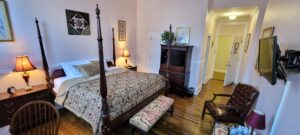 Estate King bedrooms feature a Four-Poster King bed featuring a Captain’s step. The living accommodation embodies the union of quaint and cozy, ideal if you wish to entertain guests or just appreciate all the extra space. The  Estate King is your best option for maximum comfort during your stay. You’ll enter the room to find parlor settings with traditional furniture, a large wall-mounted flat-panel television, as well as our trademark boutique décor. Along with the extra amenities of our Estate Rooms. Fees apply for third guests over the age of 1 year. *Captain’s Step: Small two to three wooden steps for entering the bed.